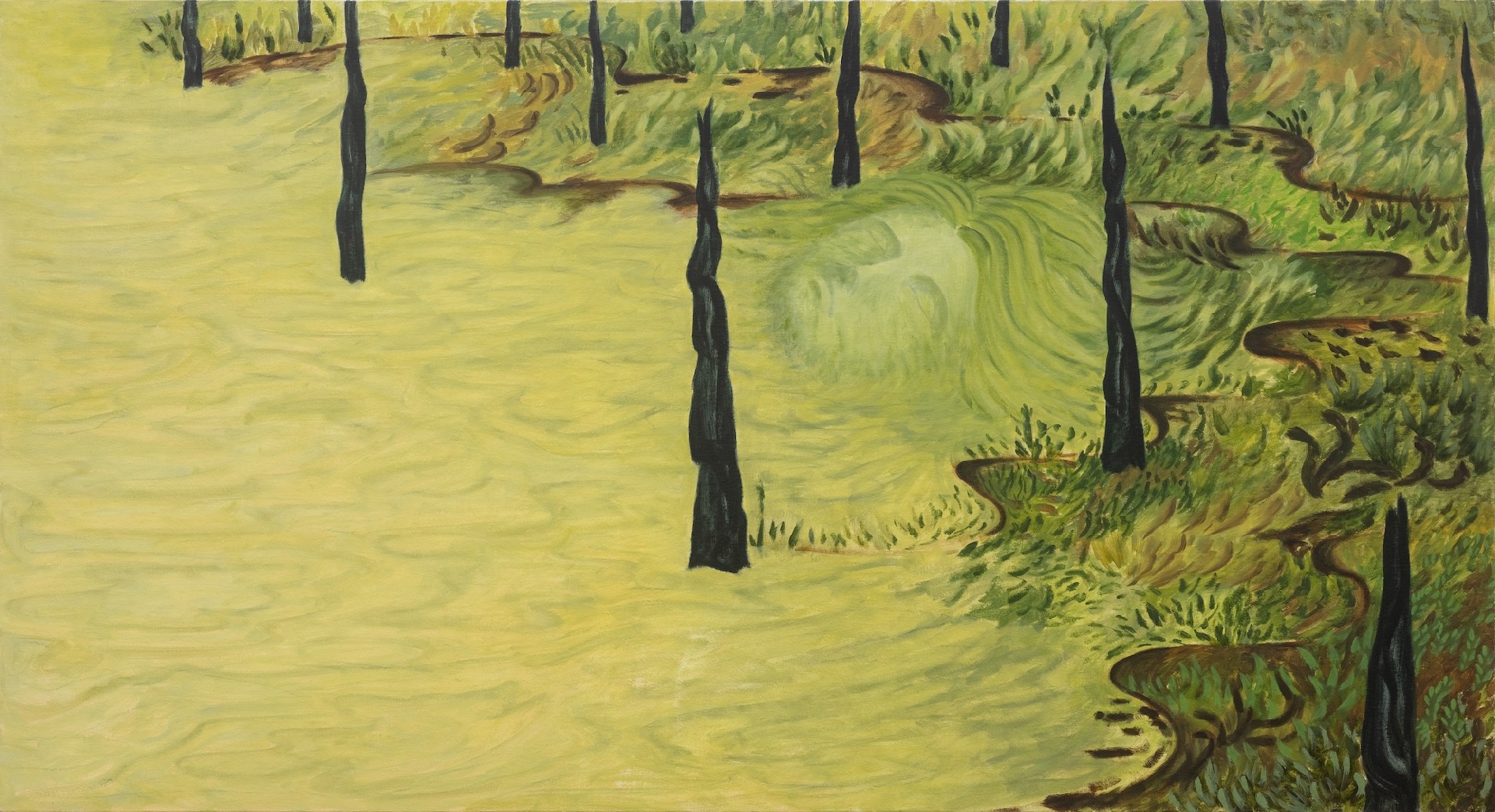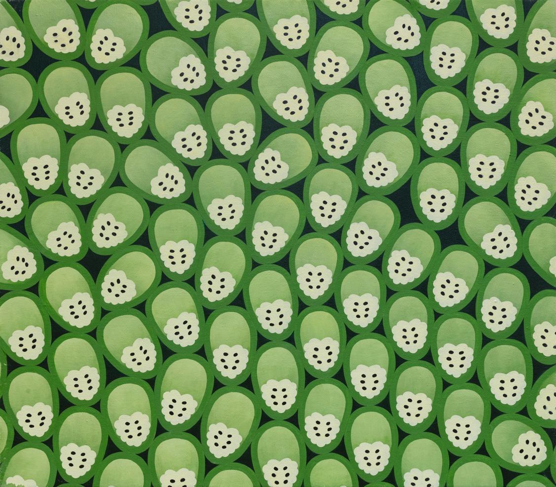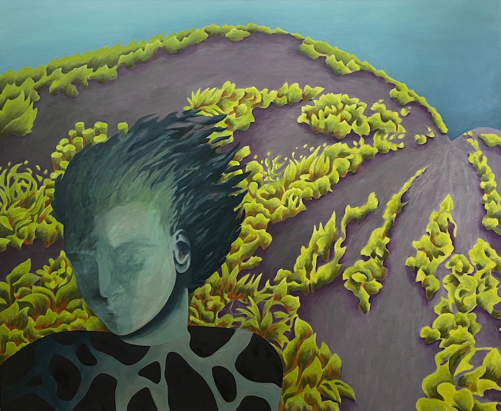 在祝洵的作品中,植物被变形、解构和重塑,从传统风景画或静物画中转身成为绘画叙事的主角。源自于现实世界的物像,在画面上跃然生成一个奇幻梦境:比例失调的花草树木,他们移动跳跃,似有内在的能量的驱使:隐于幽静处的不明精灵,唤你走向未知的深处。灵动的万物苏醒我们的意识之光,引发了我们对生活或文化历史中某个时期的追忆。